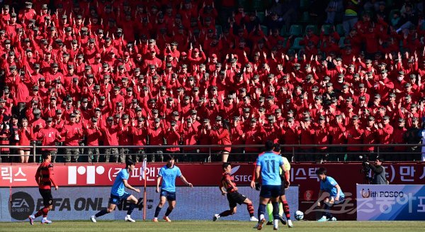 26일 포항스틸야드경기장에서 열린 ‘하나원큐 K리그1 2023’ 포항 스틸러스와 대구FC의 경기에서 해병 1사단 병사들이 응원을 펼치고 있다.