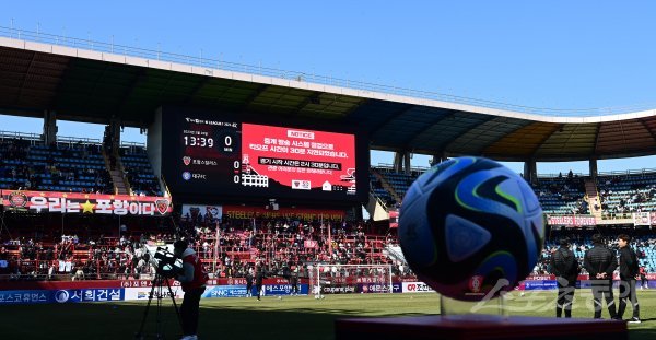 26일 포항스틸야드경기장에서 열린 ‘하나원큐 K리그1 2023’ 포항 스틸러스와 대구FC의 경기가 중계 방송 시스템 점건으로 킥오프 시간이 30분 지연돼 2시 30분 시작 예정이다.