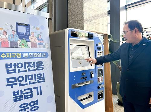 권오성 수지구청장이 법인 전용 무인민원발급기를 시범 이용하고 있다. 사진제공|용인시
