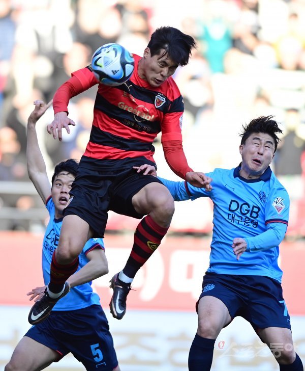 26일 포항스틸야드경기장에서 열린 ‘하나원큐 K리그1 2023’ 포항 스틸러스와 대구FC의 경기에서 포항 이호재가 헤딩슛을 하고 있다.