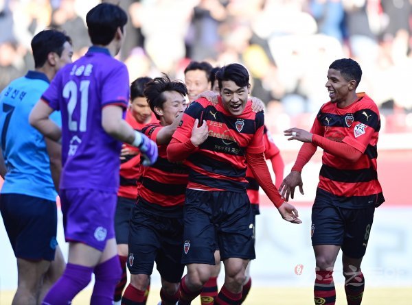 26일 포항스틸야드경기장에서 열린 ‘하나원큐 K리그1 2023’ 포항 스틸러스와 대구FC의 경기에서 포항 이호재가 역전골을 성공시킨 후 동료들과 기쁨을 나누고 있다.