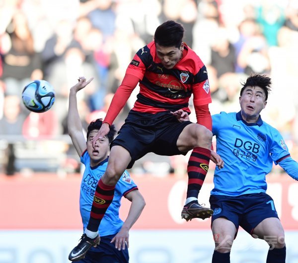 26일 포항스틸야드경기장에서 열린 ‘하나원큐 K리그1 2023’ 포항 스틸러스와 대구FC의 경기에서 포항 이호재가 헤딩슛을 하고 있다.