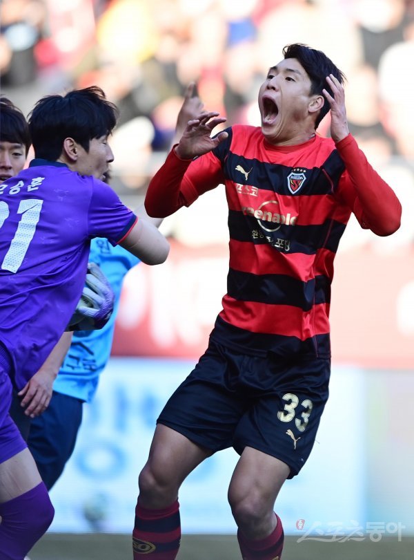 26일 포항스틸야드경기장에서 열린 ‘하나원큐 K리그1 2023’ 포항 스틸러스와 대구FC의 경기에서 포항 이호재가 골 찬스를 놓친 후 아쉬워하고 있다.