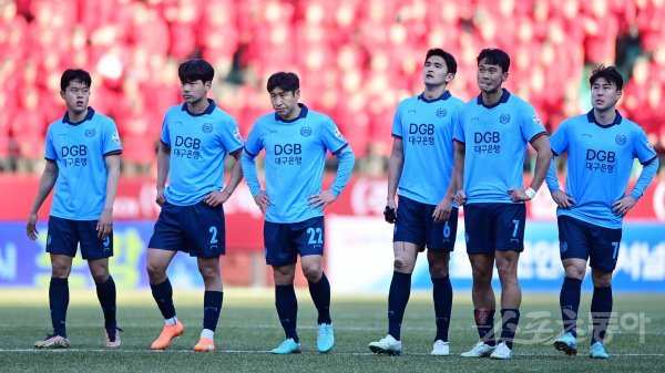 26일 포항스틸야드경기장에서 열린 ‘하나원큐 K리그1 2023’ 포항 스틸러스와 대구FC의 경기에서 2-3으로 패한 대구 선수들이 아쉬워하고 있다.