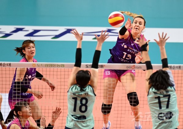 26일 서울 장충체육관에서 열린 ‘2022~2023 도드람 V-리그’ 여자부 GS칼텍스와 흥국생명 경기에서 흥국생명 엘레나가 GS칼텍스의 블로킹 사이로 스파이크를 날리고 있다.