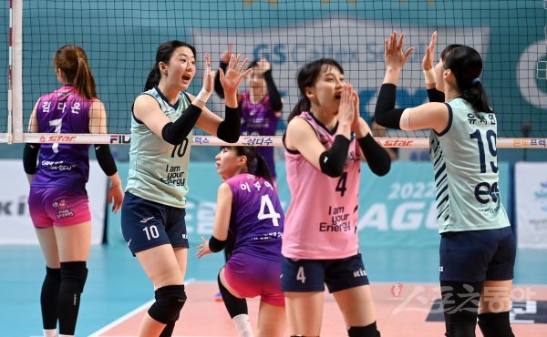 26일 서울 장충체육관에서 열린 ‘2022~2023 도드람 V-리그’ 여자부 GS칼텍스와 흥국생명 경기에서 GS칼텍스 강소휘가 득점에 성공한 후 기뻐하고 있다.