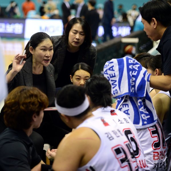27일 경기도 부천샐내체육관에서 열린 ‘신한은행 SOL 2022-2023 여자프로농구’ 부천 하나원규와 부산 BNK 썸의 경기에서 BNK 썸 박정은 감독이 작전을 지시하고 있다.