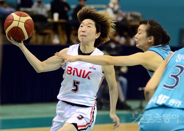 BNK 안혜지(왼쪽)가 27일 부천체육관에서 열린 하나원큐와 원정경기에서 상대 수비의 마크를 피해 골밑 슛을 시도하고 있다. BNK는 83-76으로 이기고 2위를 확정했다. 부천 | 김민성 기자 marineboy@donga.com