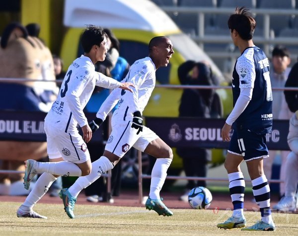 1일 서울 목동운동장 주경기장에서 열린 ‘하나원큐 K리그2 2023’ 서울 이랜드FC와 충북청주FC의 경기에서 충북청주 파울리뉴가 선제골을 성공시킨 후 기뻐하고 있다.