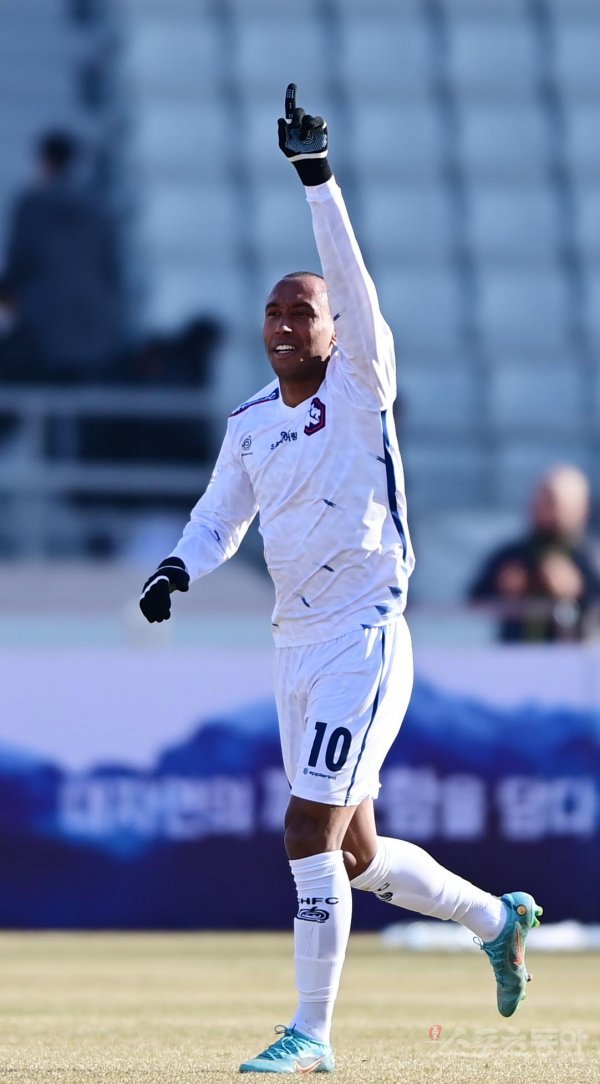 1일 서울 목동운동장 주경기장에서 열린 ‘하나원큐 K리그2 2023’ 서울 이랜드FC와 충북청주FC의 경기에서 충북청주 파울리뉴가 선제골을 성공시킨 후 세리머니를 하고 있다.