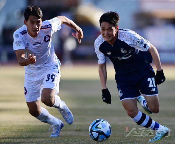 1일 서울 목동운동장 주경기장에서 열린 ‘하나원큐 K리그2 2023’ 서울 이랜드FC와 충북청주FC의 경기에서 서울이랜드 이시헌이 충북청주 김명순의 수비를 뚫고 드리블 돌파를 하고 있다.