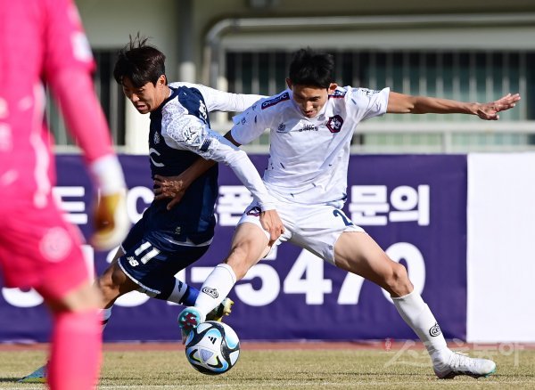 1일 서울 목동운동장 주경기장에서 열린 ‘하나원큐 K리그2 2023’ 서울 이랜드FC와 충북청주FC의 경기에서 충북청주 김지운이 서울이랜드 김정환으로부터 볼을 빼앗고 있다.
