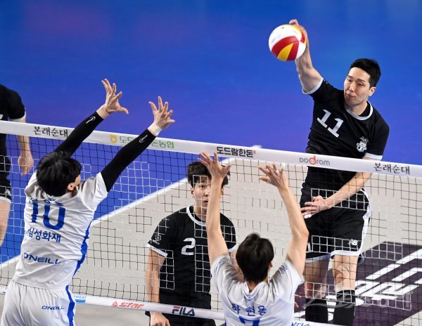 2일 천안 유관순체육관에서 열린 ‘2022~2023 도드람 V-리그’ 남자부 현대캐피탈과 우리카드 경기에서 현대캐피탈 최민호가 삼성화재의 블로킹 사이로 스파이크를 날리고 있다.