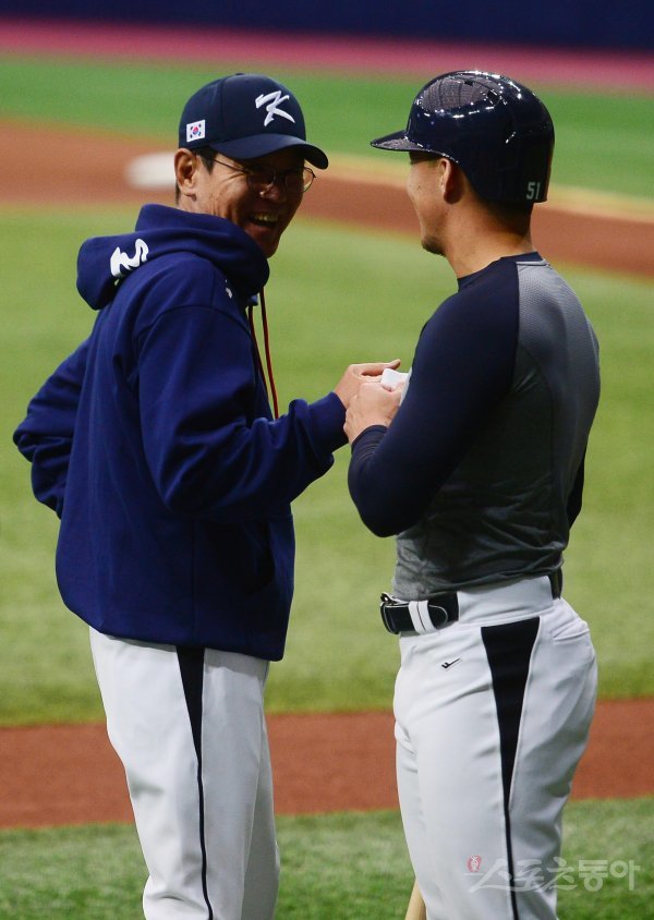 3일 서울 고척스카이돔에서 열린 WBC에 출전하는 한국야구대표팀과 SSG 랜더스 퓨처스의 연습 경기에 앞서 한국 이강철 감독이 라이브배팅을 마친 에드먼과 주먹을 맞대고 있다.
