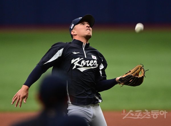 3일 서울 고척스카이돔에서 열린 WBC에 출전하는 한국야구대표팀과 SSG 랜더스 퓨처스의 연습 경기에 앞서 한국 에드먼이 수비 훈련을 하고 있다.