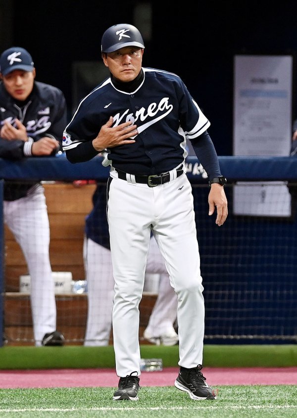 WBC 한국야구대표팀이 3일 서울 고척스카이돔에서 SSG 퓨처스팀과 연습 경기를 가졌다. 야구대표팀 김민호 코치가 작전을 지시하고 있다.