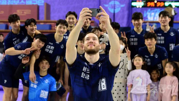 5일 인천 계양체육관에서 ‘2022-2023 도드람 V리그’ 인천 대한항공과 천안 현대캐피탈의 남자부 경기가 열렸다. 대한항공이 현대캐피탈을 상대로 세트스코어 3-0으로 승리한 후 링컨이 선수들과 셀카를 찍고 있다.