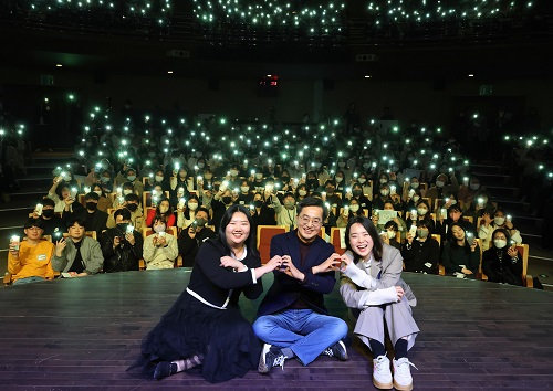 4일 오후 경기아트센터 소극장에서 김동연 경기지사(가운데), 권석필 경기도자원봉사센터 센터장, 박아람 경기도 청년봉사단 5기 단장, 이지은 경기도 청년봉사단 5기 부단장 등 청년봉사단 500여 명이 2023 경기도 청년봉사단 5기 발대식 퍼포먼스 기념촬영을 하고 있다. 사진제공|경기도