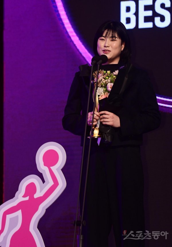 6일 서울 영등포구 여의도동 63컨벤션센터에서 열린 ‘신한은행 SOL 2022~2023 여자프로농구‘ 정규리그 시상식에서 베스트5 가드를 수상한 BNK 이소희가 소감을 말하고 있다.