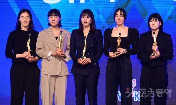 6일 서울 영등포구 여의도동 63컨벤션센터에서 열린 ‘신한은행 SOL 2022~2023 여자프로농구‘ 정규리그 시상식에서 베스트5를 수상한 삼성생명 배혜윤, 우리은행 박지현, 김단비, 신한은행 김소니아, BNK 이소희가 기념 촬영을 하고 있다.