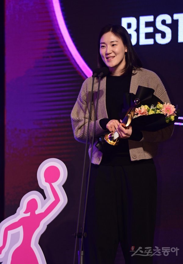 6일 서울 영등포구 여의도동 63컨벤션센터에서 열린 ‘신한은행 SOL 2022~2023 여자프로농구‘ 정규리그 시상식에서 베스트5 센터를 수상한 삼성생명 배혜윤이 소감을 말하고 있다.