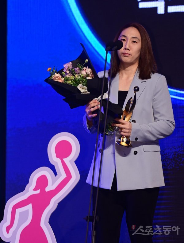 6일 서울 영등포구 여의도동 63컨벤션센터에서 열린 ‘신한은행 SOL 2022~2023 여자프로농구‘ 정규리그 시상식에서 식스우먼상을 수상한 하나원큐 김애나가 소감을 말하고 있다.