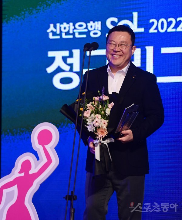 6일 서울 영등포구 여의도동 63컨벤션센터에서 열린 ‘신한은행 SOL 2022~2023 여자프로농구‘ 정규리그 시상식에서 티켓링크상을 수상한 KB 김병천 사무국장이 소감을 말하고 있다.