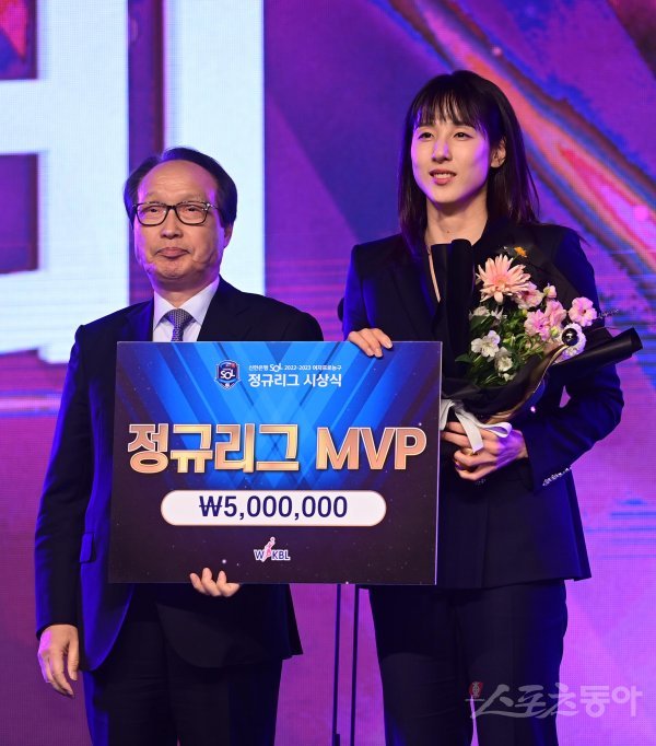 6일 서울 영등포구 여의도동 63컨벤션센터에서 열린 ‘신한은행 SOL 2022~2023 여자프로농구‘ 정규리그 시상식에서 MVP를 수상한 우리은행 김단비가 WKBL 이병완 총재와 기념 촬영을 하고 있다.