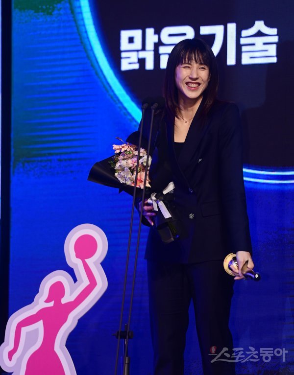 6일 서울 영등포구 여의도동 63컨벤션센터에서 열린 ‘신한은행 SOL 2022~2023 여자프로농구‘ 정규리그 시상식에서 맑은기술 윤덕주상을 수상한 우리은행 김단비가 소감을 말하고 있다.