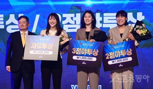 6일 서울 영등포구 여의도동 63컨벤션센터에서 열린 ‘신한은행 SOL 2022~2023 여자프로농구‘ 정규리그 시상식에서 통계 부문 자유투상, 3점야투상, 2점야투상을 수상한 KB 강이슬, 우리은행 최이샘, 박지현이 KB 김진영 단장과 기념 촬영을 하고 있다.