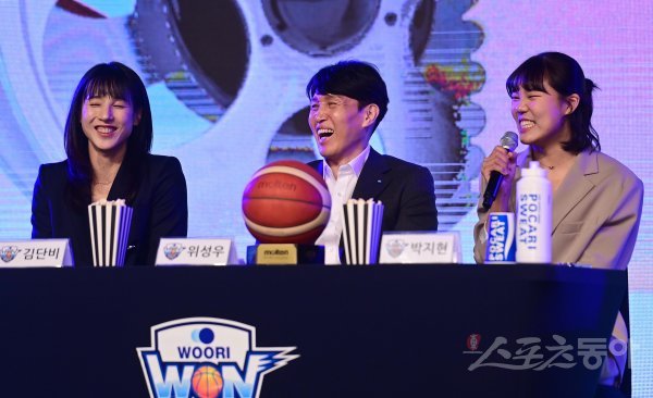 6일 서울 영등포구 여의도동 63컨벤션센터에서 열린 ‘신한은행 SOL 2022~2023 여자프로농구‘ 플레이오프 미디어데이에서 우리은행 박지현의 장난에 김단비와 위성우 감독이 웃고 있다.