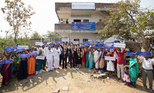 지난 2월 20일 인도 벳세다은혜교회에서 목회자 간판 현판식을 진행한 가운데 관계자들이 위아원을 외치며 기념 촬영을 하고 있다. 사진제공ㅣ신천지예수교회