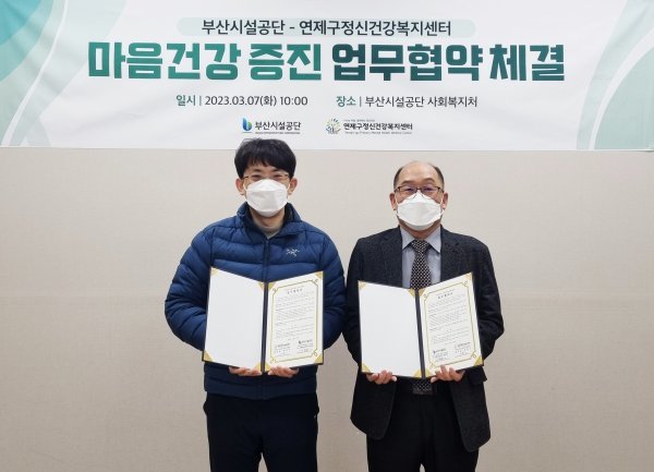 부산시설공단은 연제구 정신건강복지센터와 7일 오전 본관에서 마음건강 증진 프로그램의 원활한 추진을 위해 업무협약을 체결했다고 밝혔다.