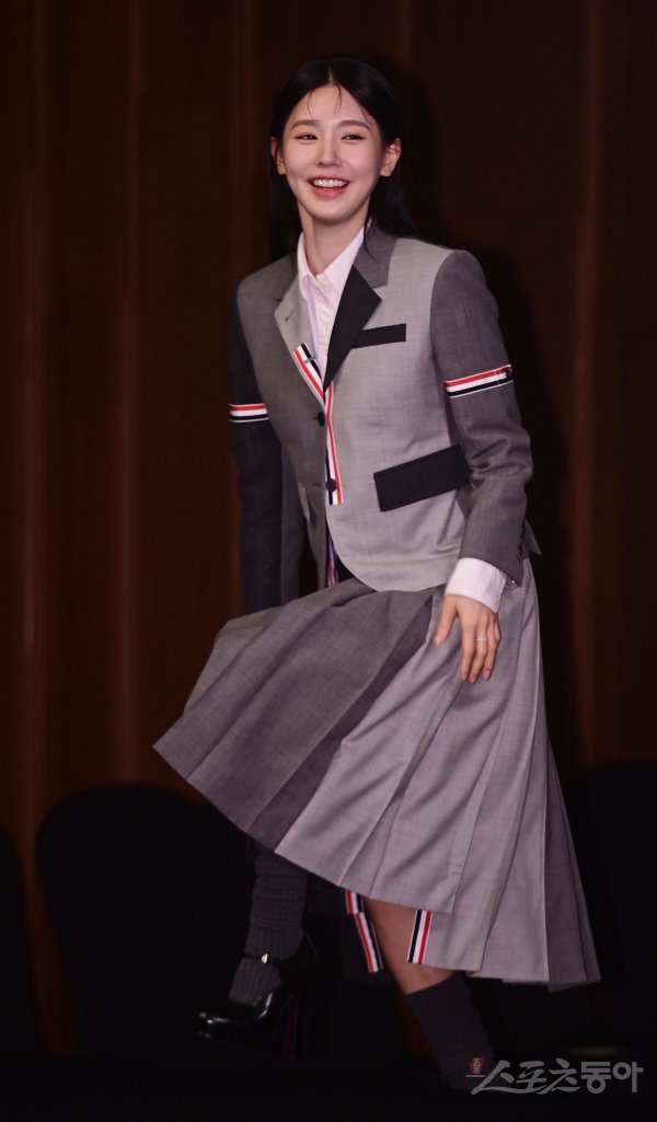 (여자)아이들 미연이 9일 서울 마포구 상암동 스탠포드 서울에서 열린 ENA 예능 프로그램 ‘혜미리예채파’ 제작발표회 무대에 입장하고 있다.