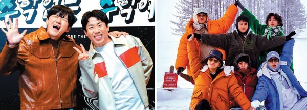 기자간담회에서 포즈를 취하고 있다. 오른쪽 사진은 두 사람을 비롯해 가수 크러쉬, 엑소 디오, 잔나비 최종훈이 일본 홋카이도에서