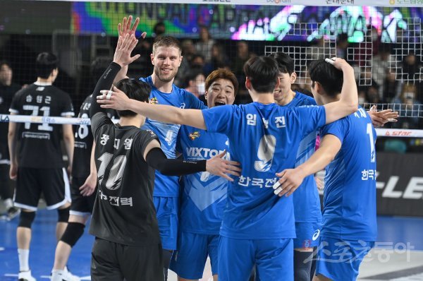 9일 천안 유관순체육관에서 열린 ‘2022~2023 도드람 V-리그’ 남자부 현대캐피탈과 한국전력 경기에서 세트스코어 3-0 완승을 거둔 한국전력 선수들이 기뻐하고 있다.