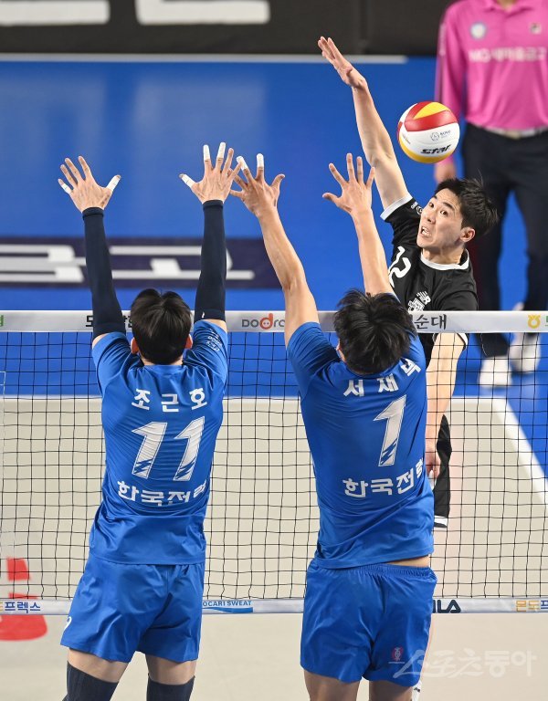 9일 천안 유관순체육관에서 열린 ‘2022~2023 도드람 V-리그’ 남자부 현대캐피탈과 한국전력 경기에서 현대캐피탈 전광인이 한국전력의 블로킹 사이로 밀어넣기 공격을 하고 있다.