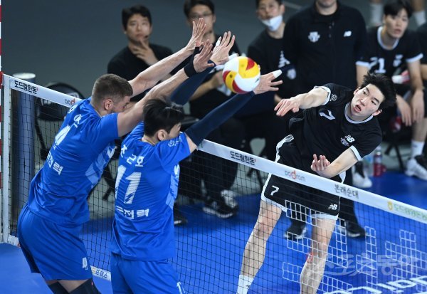 9일 천안 유관순체육관에서 열린 ‘2022~2023 도드람 V-리그’ 남자부 현대캐피탈과 한국전력 경기에서 현대캐피탈 허수봉이 한국전력의 블로킹 사이로 스파이크를 날리고 있다.