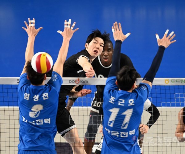 9일 천안 유관순체육관에서 열린 ‘2022~2023 도드람 V-리그’ 남자부 현대캐피탈과 한국전력 경기에서 현대캐피탈 허수봉이 한국전력의 블로킹 사이로 스파이크를 날리고 있다.