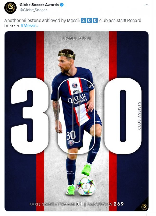 FIFA 월드컵 스태츠 트위터에 따르면 메시는 2005년 바르셀로나에서 등번호 30번 유니폼을 입고 호나우지뉴에게 첫 어시스트를 배달했다. 그리고 이날 PSG에서 같은 등번호를 달고 음바페의 골을 도와 300번째 어시스트를 달성했다.