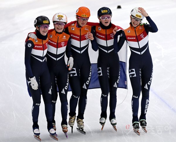 12일 서울 목동 아이스링크에서 열린 ‘2023 KB금융 국제빙상경기연맹(ISU) 쇼트트랙 세계선수권대회’ 여자계주 3000m 결승전 경기에서 네덜란드가 금메달을 차지한 후 기쁨을 나누고 있다.