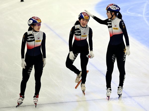 12일 서울 목동 아이스링크에서 열린 ‘2023 KB금융 국제빙상경기연맹(ISU) 쇼트트랙 세계선수권대회’ 여자계주 3000m 결승전 경기에서 한국 최민정, 김길리, 김건희가 은메달을 차지한 후 서로 격려하고 있다.