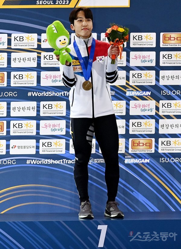 12일 서울 목동 아이스링크에서 열린 ‘2023 KB금융 국제빙상경기연맹(ISU) 쇼트트랙 세계선수권대회’ 남자 1,000m 경기에서 금메달을 획득한 한국 박지원이 포즈를 취하고 있다.