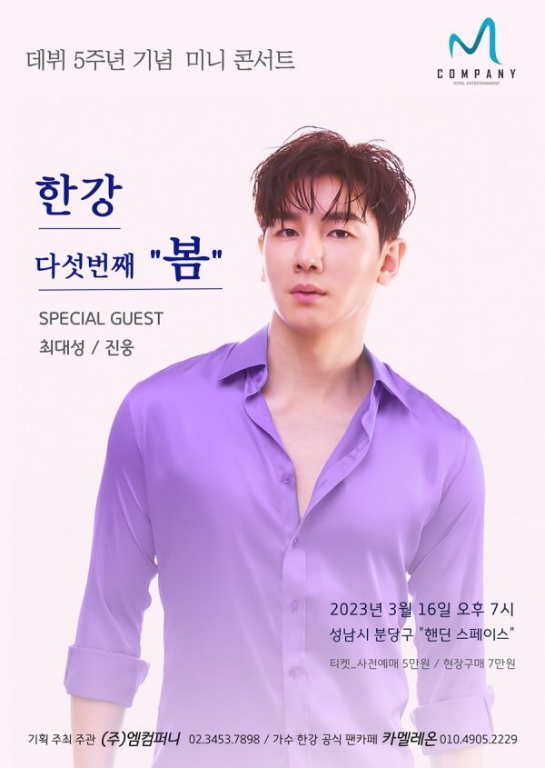 한강의 소속사 엠컴퍼니 측은 “최근 MBN ‘불타는 트롯맨’을 마친 한강이 휴식할 틈도 없이 바로 데뷔 5주년 콘서트 준비에 매진했다. 그동안 응원해주신 팬분들에게 더욱 가깝게 다가가는 자리를 마련하기 위해 공연을 기획했다”고 밝혔다.