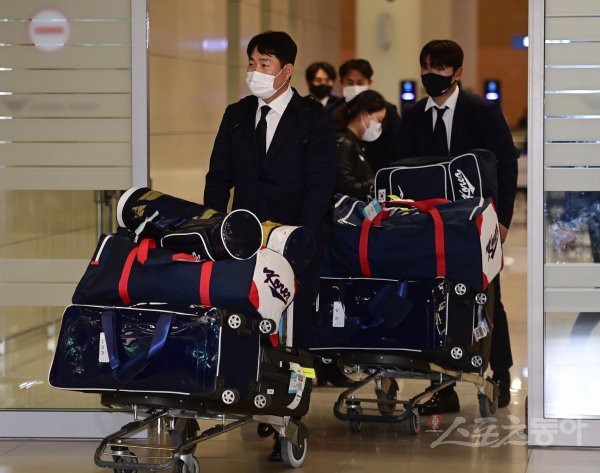 WBC 한국야구대표팀이 2승 2패로 1라운드에 탈락하며 14일 인천국제공항 2터미널을 통해 귀국하고 있다. 한국 양의지가 공항을 빠져나가고 있다.
