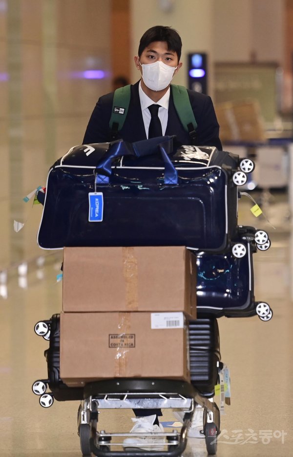 WBC 한국야구대표팀이 2승 2패로 1라운드에 탈락하며 14일 인천국제공항 2터미널을 통해 귀국하고 있다. 한국 이의리가 공항을 빠져나가고 있다.