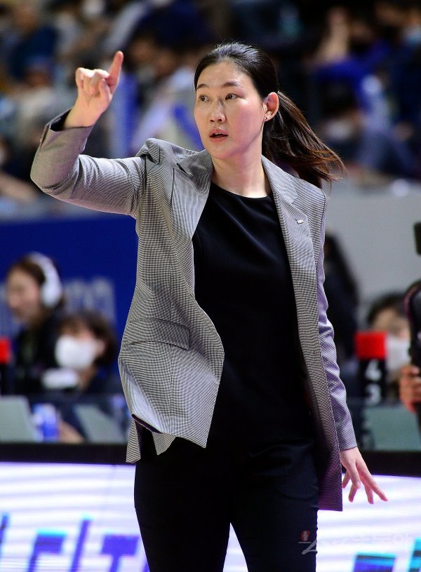 14일 경기도 용인실내체육관에서 열린 ‘신한은행 SOL 2022-2023 여자프로농구’ 용인 삼성생명과 부산 BNK 썸의 4강 플레이오프 경기에서 BNK 썸 박정은 감독이 작전을 지시하고 있다.