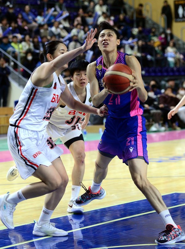 14일 경기도 용인실내체육관에서 열린 ‘신한은행 SOL 2022-2023 여자프로농구’ 용인 삼성생명과 부산 BNK 썸의 4강 플레이오프 경기에서 삼성생명 이해란이 BNK 썸 수비를 피해 슛을 쏘고 있다.