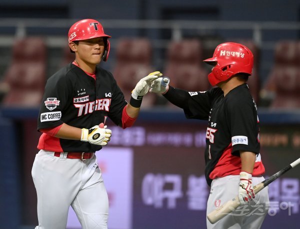 15일 서울 고척스카이돔에서 2023 KBO리그 시범경기 KIA 타이거즈와 키움 히어로즈 경기가 열렸다. 3회초 2사 KIA 김도영이 좌월 솔로 홈런을 날리고 그라운드를 돌아 홈인해 하이파이브 하고 있다.