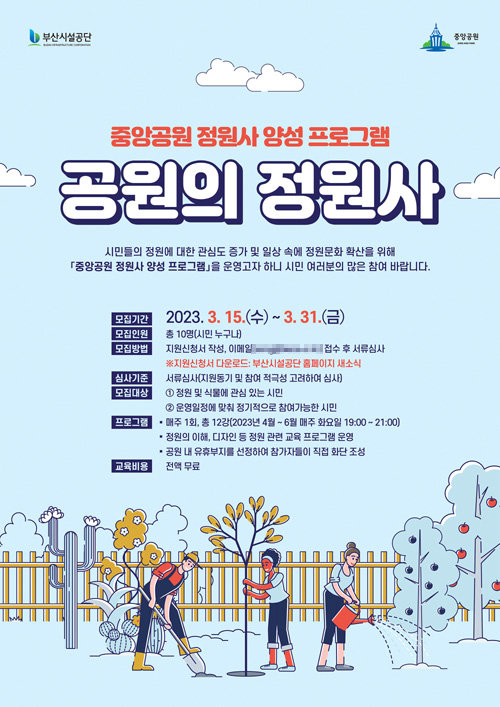 부산시설공단(이사장 직무대행 박인호)이 중앙공원 정원사 양성 프로그램 교육생을 오는 31일까지 공개 모집한다.교육 후 시민이 직접 정원 조성·실습